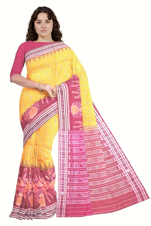 Odisha Sambalpuri Handloom Ikat Women's Cotton Saree Traditional Craftsmanship Double Ikat Weaving Floral and Rich Cultural Heritage (M-28)