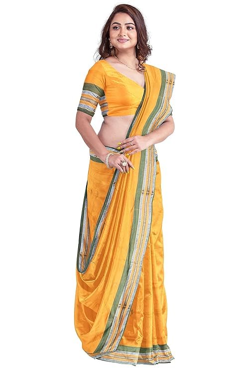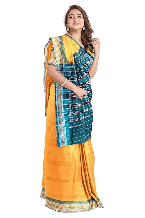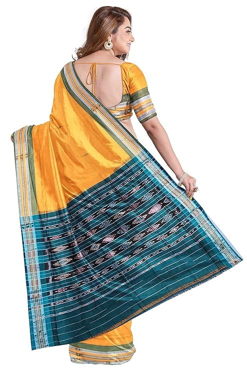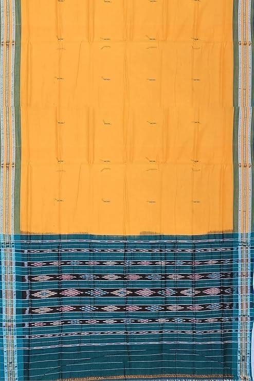 Traditional Handloom Saree, Yellow and Teal Colour, Ikat Border Pattern - By Utkal Handlooms